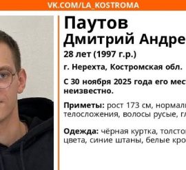 О местонахождении 28-летнего Дмитрия Паутова неизвестно с 30 ноября В Костромской области продолжаются поиски 28-летнего Дмитрия Андреевича Паутова, который пропал без вести с 30 ноября 2025 года. К поискам мужчины сегодня, 4 декабря, подключились беспилотники. В официальной группе поисково-спасательного отряда «ЛизаАлерт» добровольцы призвали всех неравнодушных на помощь в поисках. Напомним, что последний раз мужчину видели