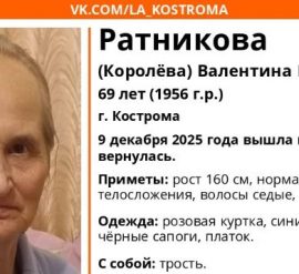 Пожилая женщина ушла из дома и не вернулась В Костроме с 9 декабря ищут 69-летнюю Валентину Васильевну Ратникову (Королеву), которая ушла из дома и не вернулась. Ориентировку на ее поиски разместили в официальной группе добровольцы поисково-спасательного отряда «ЛизаАлерт». Особые приметы пенсионерки: рост 160 сантиметров, нормальное телосложение, седые волосы и карие глаза. Была одета в розовую
