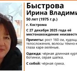 Ирина Владимировна Быстрова бесследно исчезла 27 декабря В Костроме пятый день ищут 50-летнюю Ирину Владимировну Быстрову. Ориентировку на женщину разместили в официальной группе ВКонтакте добровольцы поисково-спасательного отряда «ЛизаАлерт». Тревогу после исчезновения Ирины Владимировны забили родственники. Последний раз они видели женщину 27 декабря. Особые приметы пропавшей: рост 160 сантиметров, худощавое телосложение, темно-каштановые волосы и каре-зеленые глаза.