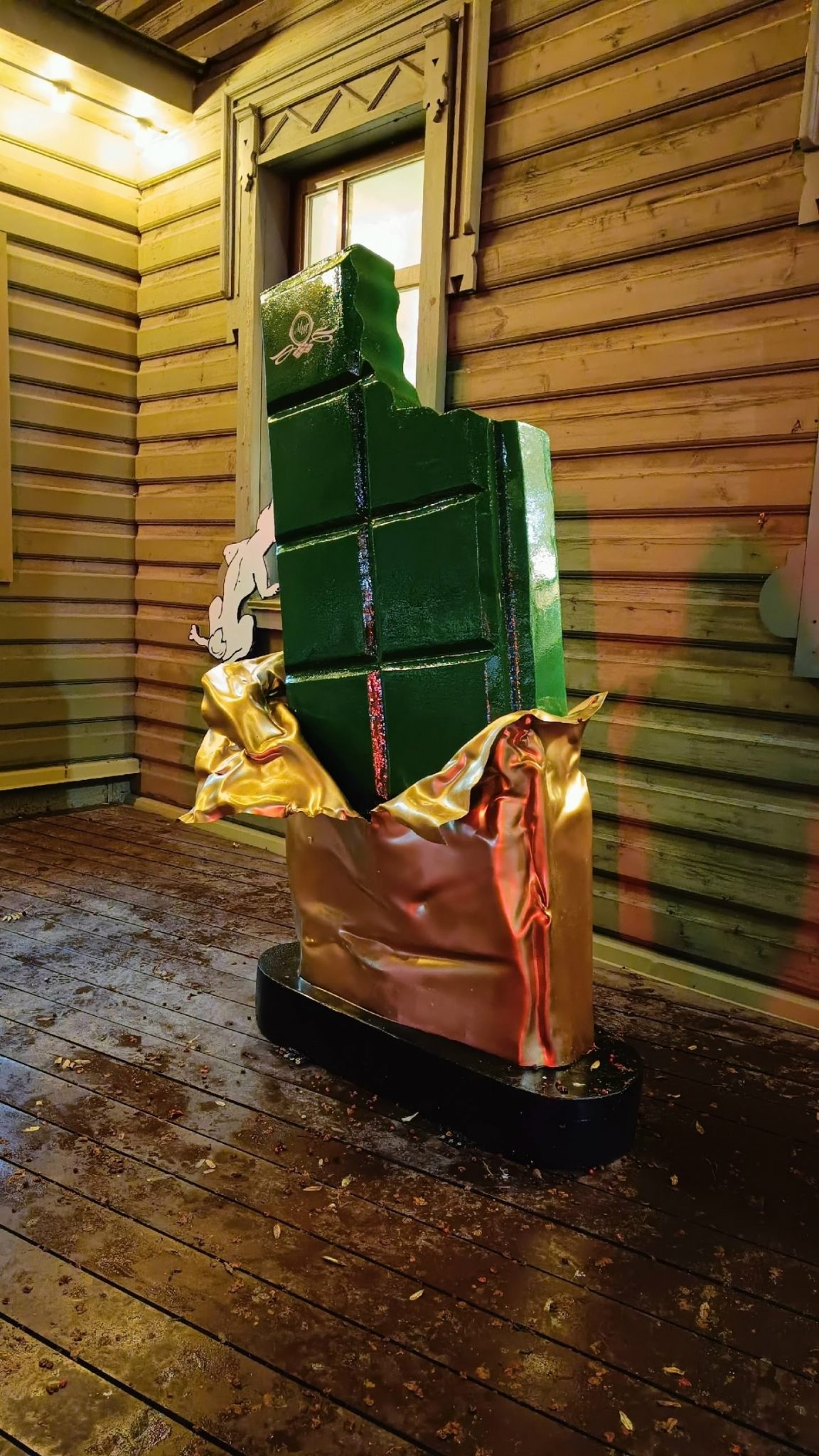 Предыстория зеленой шоколадки держится в секрете. Возможно, это просто красивая инсталляция для привлечения внимания, а, может, музей готовит выставку с необычными видами угощений.