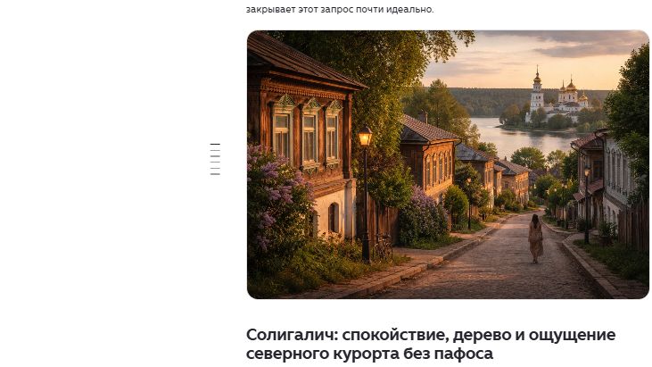 Первым пунктом в маршруте Марка Еремина, по его словам, стала Нерехта. Там блогера очаровали старинные наличники на деревянных домах и неспешный образ жизни местных жителей. По мнению блогера этот город идеально подходит для тех, кто ценит саму прогулку как самостоятельное и значимое событие. Однако иллюстрация в Нерехте оказалась больше похожа на генерацию нейросетью.